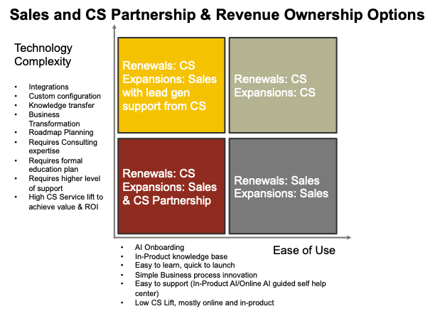 The SaaS companies using this model where Sales owns both expansion and renewals usually have a SaaS product that is fairly intuitive and easy to implement with a minimal lift and can expand across the organization organically or with a minimum sales effort. The solutions are easy to use and require low technical expertise.
